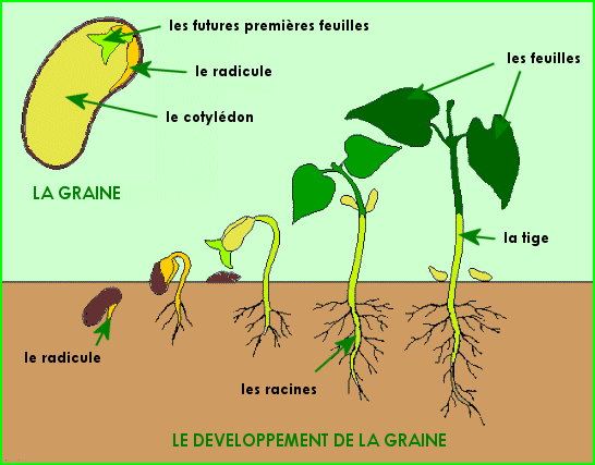 Une graine placée dans de bonnes conditions commence par gonfler, car elle absorbe de l'eau.La peau de la graine éclate. La radicule du germe apparaît, s'enfonce dans le sol, et se couvre de poils absorbants.La tigelle grandit, puis sort de terre en entraînant avec elle les deux cotylédons ; on dit alors que la graine lève. La tigelle est la partie de l'embryon végétal qui lie la radicule au cotylédon. Le cotylédon est le lobe charnu qui forme le placenta d'une graine.